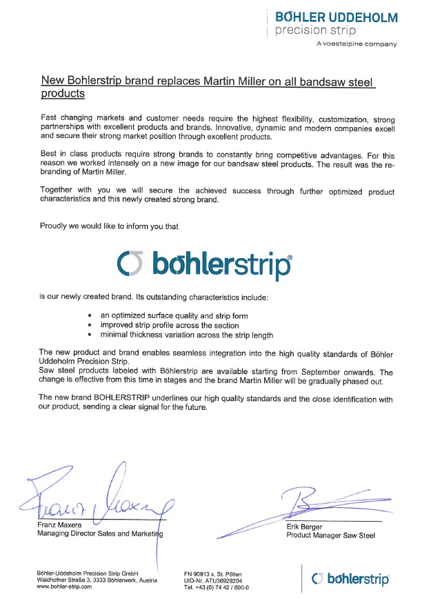 A gatter fűrészek alapanyaga a Martin Miller cég által ajánlott (Böhler-Uddeholm group) (EN ISO 9001:2000 registration number: 201004039/00). A mini gatter fűrészlapokat a következő méretben kínáljuk: 10 x 0,4 mm-től, 60 x 1,0 mm-ig DIN C75, 435-450 HV